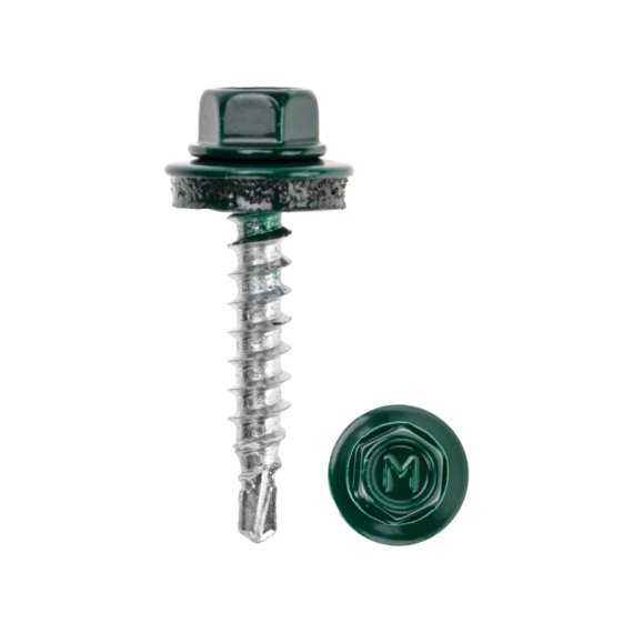 Шестигранная головка покрыта порошковой краской RAL 6005, что позволяет подобрать саморез под цвет крыши.