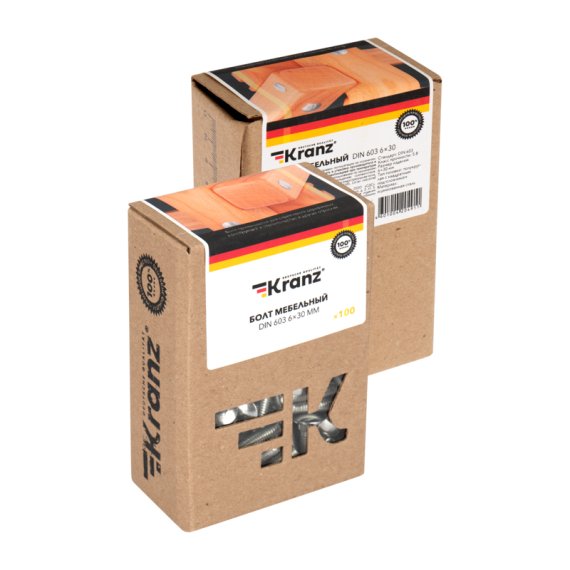 Болт мебельный DIN 603, 6,0х30мм, короб (100 шт/уп) KRANZ Мебельный болт DIN 603 6х30 мм предназначен для соединения деревянных и металлических конструкций при производстве мебели и в строительстве, для монтажа дорожных ограждений, для крепления узлов и деталей в машиностроении. Широко распространен в электротехнике при сборке щитков и конструкций кабеленесущих систем. Используется совместно с гайками и шайбами. Болты изготовлены из стали с гальваническим цинковым покрытием, которое защищает изделия от коррозии и механических повреждений. Квадратный подголовник предотвращает проворачивание болта в отверстии, а сферическая головка увеличенного диаметра не повреждает поверхность основания и придает аккуратный и эстетичный вид изделию. Поставляются в крафтовой коробке в количестве 100 штук.