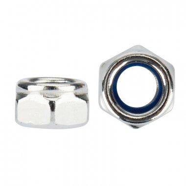 DIN 985 – гайка самоконтрящаяся с нейлоновым стопорным кольцом. Нейлоновое кольцо предотвращает самопроизвольное откручивание гайки и герметизирует соединение. Применяется в тех соединениях, где возможно самопроизвольное откручивание из-за вибрации (инструменты, станки и т. п.). Благодаря завальцованной полиамидной вставке (нейлон) сама себя фиксирует, при применении этих гаек шайбы не требуются.