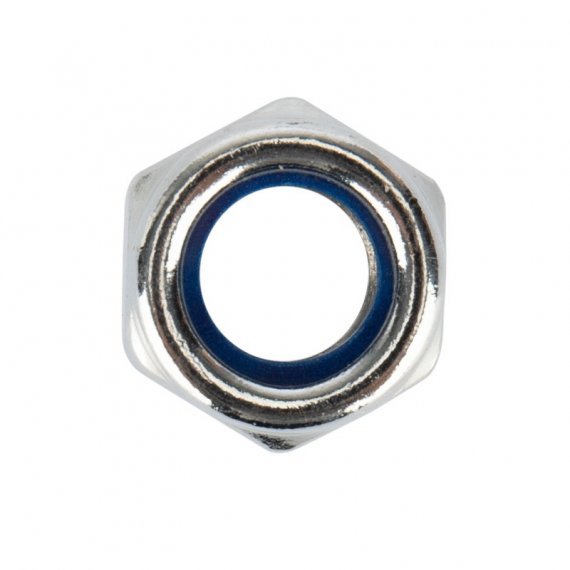 DIN 985 – гайка самоконтрящаяся с нейлоновым стопорным кольцом. Нейлоновое кольцо предотвращает самопроизвольное откручивание гайки и герметизирует соединение. Применяется в тех соединениях, где возможно самопроизвольное откручивание из-за вибрации (инструменты, станки и т. п.). Благодаря завальцованной полиамидной вставке (нейлон) сама себя фиксирует, при применении этих гаек шайбы не требуются.