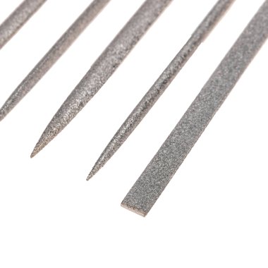 Набор комплектуется десятью надфилями с напылением из алмазной крошки, которые применяются для мелких слесарных работ с особо твердыми материалами: металлом, керамической плиткой, стеклом и др.