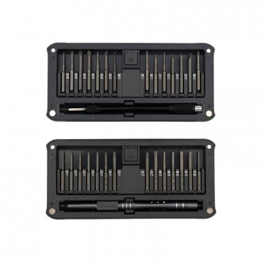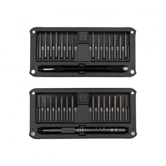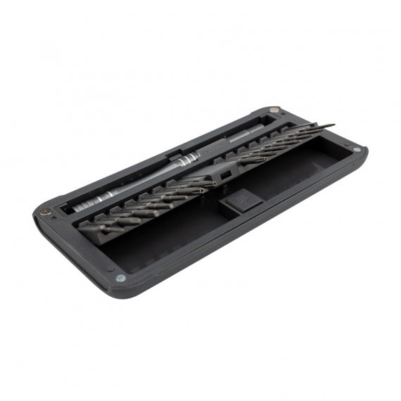 В наборе отвертка с 29 битами: 1.5, 2.0, 3.0, 4.0 PH0, PH1, PH2, PH00, PH000, T1, T2, T3, T4, T5, TR6, TR8, TR10, TR15, H1.5, H2.0, H3.0, P2, P5, P6, U2.6, Y0.7, Y3, Triangle 2.3, Special PH2.5.