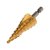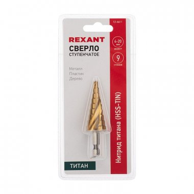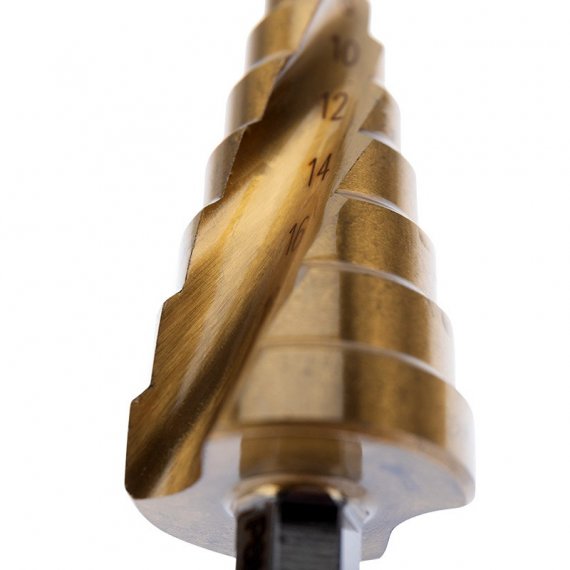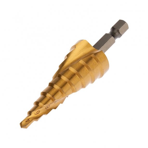 Ступенчатое сверло предназначено для сверления отверстий различных диаметров. Применяется в работе с такими материалами, как: пластик, дерево, металл и др. Хвостовик сверла цилиндрический. На каждой ступени есть маркировка фактического диаметра. Сверло изготовлено из инструментальной легированной стали и покрыто нитридом титана. Обладает такими преимуществами, как: повышенная точность; повышенная прочность; универсальность применения; высокий рабочий ресурс.