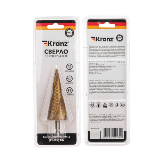 Сверло по металлу ступенчатое ТИТАН 4,0-32,0мм, 102мм, 65 HRC, Р6М5 TiN KRANZ
