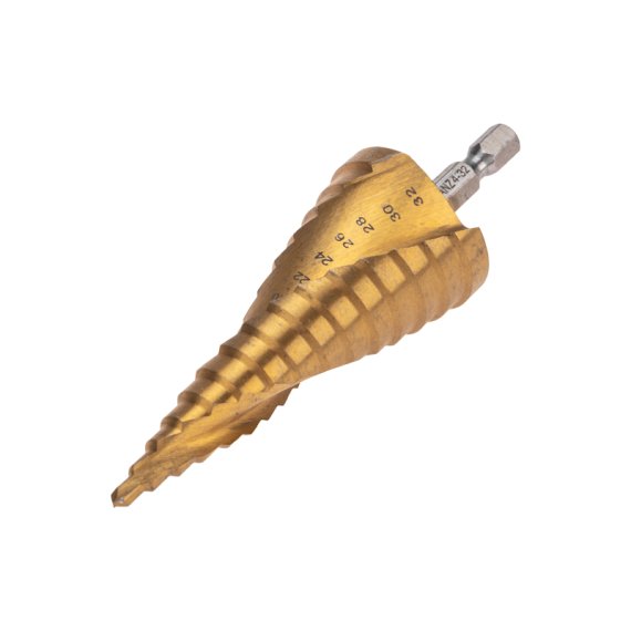 На каждой из 15 ступеней сверла нанесена маркировка фактического диаметра. Диапазон ступеней: 4, 6, 8, 10, 12, 14, 16, 18, 20, 22, 24, 26, 28, 30, 32 (шаг 2 мм).