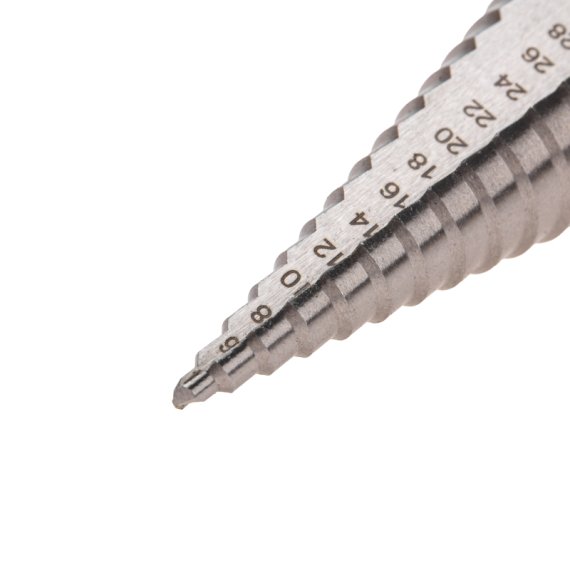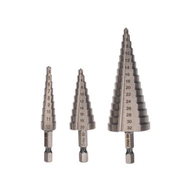 Комплект содержит ступенчатые сверла следующих диаметров: №1: 4,5,6,7,8,9,10,11,12; №2: 4, 6, 8, 10, 12, 14, 16, 18, 20; №3: 4, 6, 8, 10, 12, 14, 16, 18, 20, 22, 24, 26, 28, 30, 32