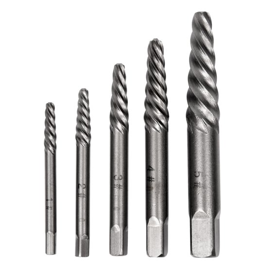 Набор состоит из пяти экстракторов разных размеров, что позволяет использовать их для различных типов и размеров шурупов.