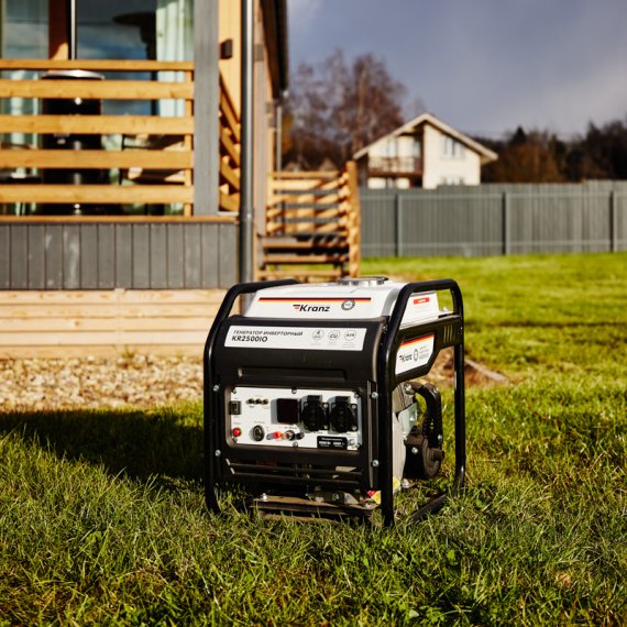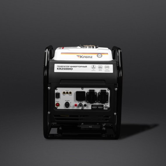 Генератор инверторный KR2500IO, 2,5кВт, 230В, 7л, открытый корпус, ручной старт KRANZ Инверторный генератор KR2500IO отличается легкостью и компактностью, что делает его идеальным выбором для использования во время выездов на природу, рыбалку или пикники. Также генератор будет незаменим на дачном участке или в торговой палатке. Специальный экономичный режим уменьшает расход топлива благодаря точной регулировке подачи в зависимости от нагрузки генератора и электронной системы зажигания. В бензобаке установлен индикатор уровня топлива. Многофункциональный дисплей информативно отображает часы работы, напряжение, частоту тока и предупреждает о низком уровне масла. Многоступенчатая система защиты от повреждений гарантирует безопасность работы. Обмотка альтернатора из 100% меди эффективно проводит ток и минимизирует нагрев при значительных нагрузках. Низкий уровень шума (96 дБ) достигается благодаря равномерной нагрузке двигателя. Стальная усиленная рама эффективно защищают внутренние узлы генератора от механических повреждений. Резиновые амортизаторы обеспечивают надежную устойчивость и защиту от вибраций. Предусмотрены: два типа выходного напряжения 220В/50Гц и 12 В постоянного тока для подключения различных потребителей, усиленный шнур стартера. Четырехтактный двигатель (212 см3) мощностью 7 л.с. работает стабильно и обеспечивает эффективную работу.