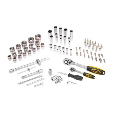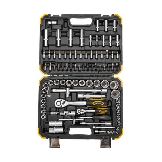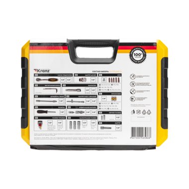 Набор инструментов KRANZ 1/2 и 1/4 дюйма, CrV, состоит из 94 предметов в пластиковом кейсе и предназначен для выполнения различных слесарно-монтажных работ.