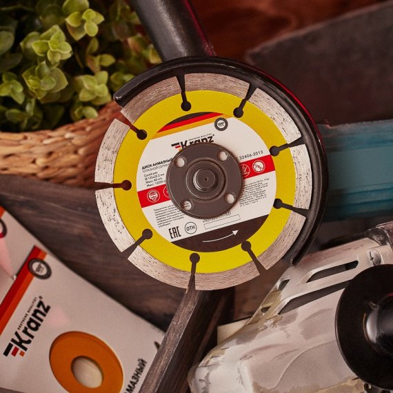 Диск алмазный отрезной сегментный 125x22.2 мм KRANZ предназначен для сухой резки строительных материалов, таких как природный и искусственный камень, армированный бетон, кирпич, керамика. Используется в угловой шлифовальной машине, ручном электрическом плиткорезе, штроборезе. Состоит из алмазных сегментов и стального корпуса. Процесс резки сопровождается воздушным охлаждением. Срок годности не ограничен. Хранить в сухом прохладном месте. Использовать строго по назначению.
