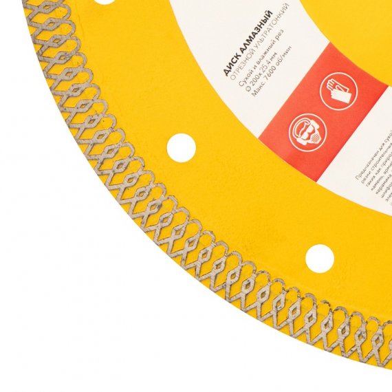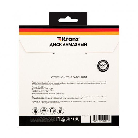 Диск алмазный отрезной ультратонкий 200x22.2/25,4 KRANZ предназначен для сухой и мокрой резки строительных материалов, таких как гранит, керамогранит, песчаник, клинкер, мрамор, керамика. Используется в угловой шлифовальной машине, ручном электрическом плиткорезе. Материал изделия: инструментальная сталь, синтетический алмаз. Процесс резки сопровождается воздушным охлаждением. Срок годности не ограничен. Хранить в сухом прохладном месте. Использовать строго по назначению.