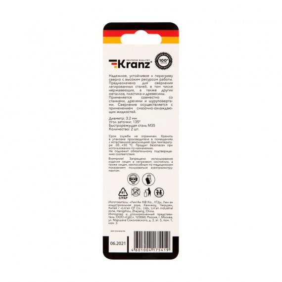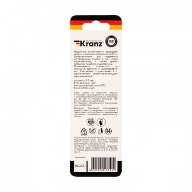 Сверло по металлу 3,2х65х36 мм «Кобальт» (сталь HSS-Co 5% M35 P6M5K5) (2 шт. в блистере) DIN 338 Kranz