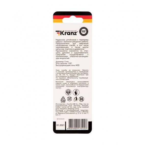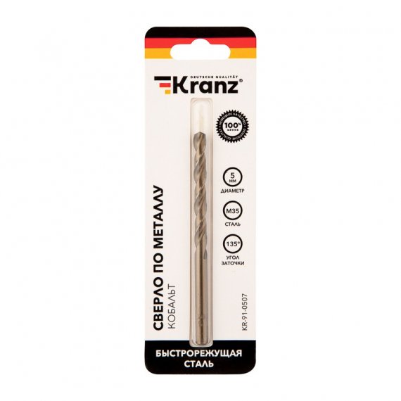 Сверло по металлу 5х86х52 мм «Кобальт» (сталь HSS-Co 5% M35 P6M5K5) (1 шт. в блистере) DIN 338 Kranz