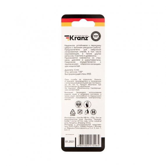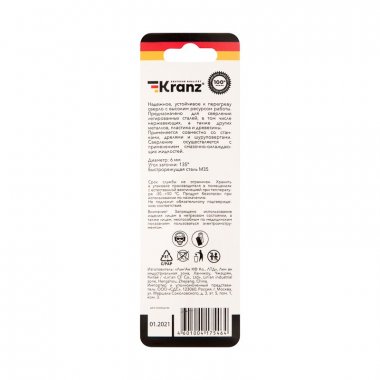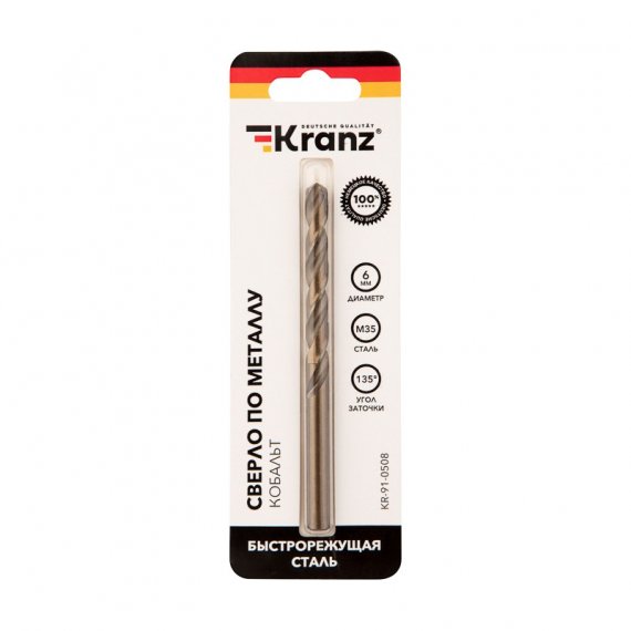 Сверло по металлу 6х93х57 мм «Кобальт» (сталь HSS-Co 5% M35 P6M5K5) (1 шт. в блистере) DIN 338 Kranz