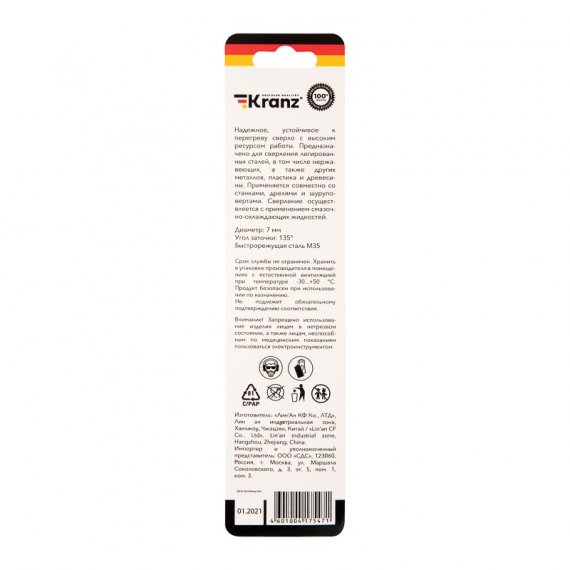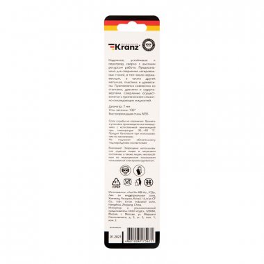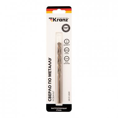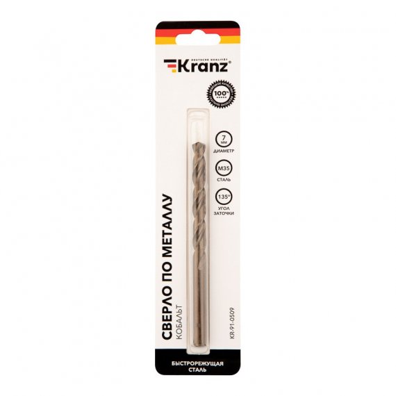 Сверло по металлу 7х109х69 мм «Кобальт» (сталь HSS-Co 5% M35 P6M5K5) (1 шт. в блистере) DIN 338 Kranz