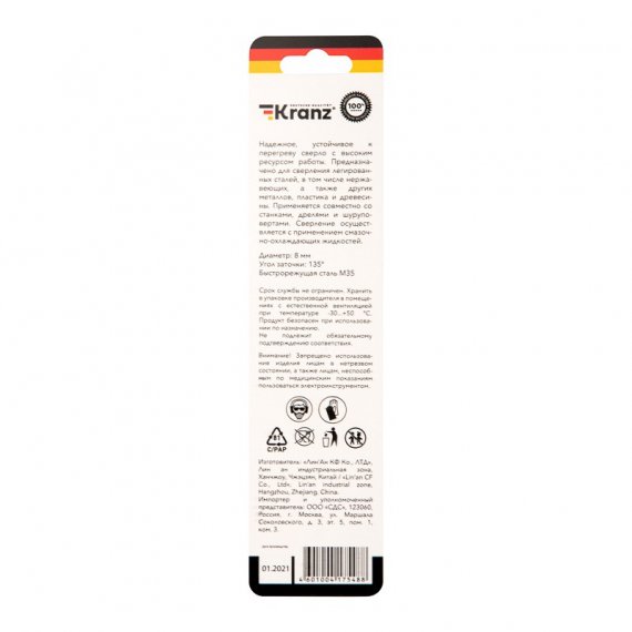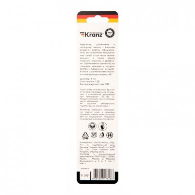 Сверло по металлу 8х117х75 мм «Кобальт» (сталь HSS-Co 5% M35 P6M5K5) (1 шт. в блистере) DIN 338 Kranz