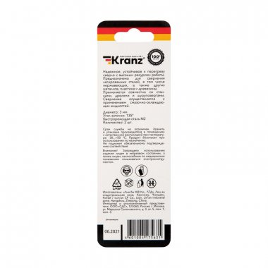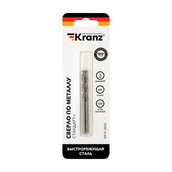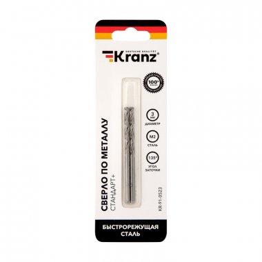 Сверло по металлу 3х61х33 мм «Стандарт+» (P6M5 M-2) (2 шт. в блистере) DIN 338 Kranz