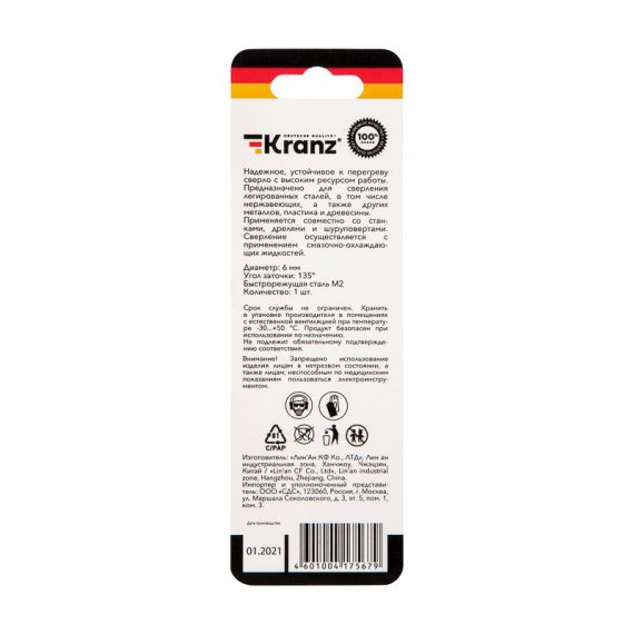 Сверло по металлу KRANZ соответствует стандартам профессиональной оснастки и используется во время различных ремонтных работ. Предназначено для сверления отверстий в нержавеющей и жаростойкой стали, легированной и нелегированной стали, сером чугуне, стальном литье, кислотостойкой стали, металлокерамике, цветных металлах и твердой пластмассе при помощи дрели с цилиндрическим креплением, которое используется в большинстве электроинструментов бытового и профессионального назначения. Изделие выполнено из качественной стали, что обеспечивает долгий ресурс работы и высокую производительность, а также препятствует быстрому нагреву во время использования. Конструкция со стабилизирующей спиралью сохраняет точное положение оснастки во время сверления, что гарантирует ровные и аккуратные отверстия. Заточка режущей части под углом 135 градусов способствует эффективному входу в материал, что увеличивает цикл службы оснастки и уменьшает износ бура. Оснастка выпускается на современном производстве, что снижает возможность изготовления бракованных изделий. Технологичные сверла рассчитаны на долгий срок службы, а стандарт DIN 338 гарантирует качество. Ресурс использования заметно увеличивается при использовании СОЖ. Диаметр хвостовика соответствует диаметру сверла.
