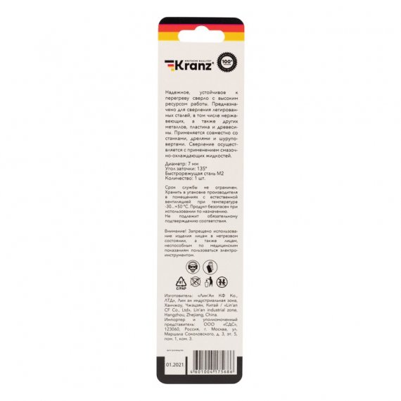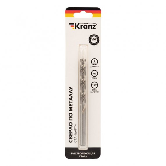 Сверло по металлу 7х109х96 мм «Стандарт+» (P6M5 M-2) (1 шт. в блистере) DIN 338 Kranz