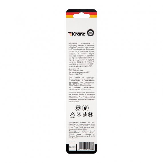 Сверло по металлу 10х133х87 мм «Стандарт+» (P6M5 M-2) (1 шт. в блистере) DIN 338 Kranz