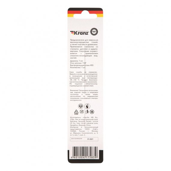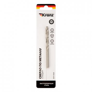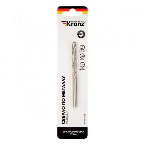 Сверло по металлу 7,0х109х69 мм HSS (1 шт. в упаковке) DIN 338 Kranz