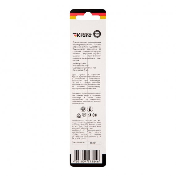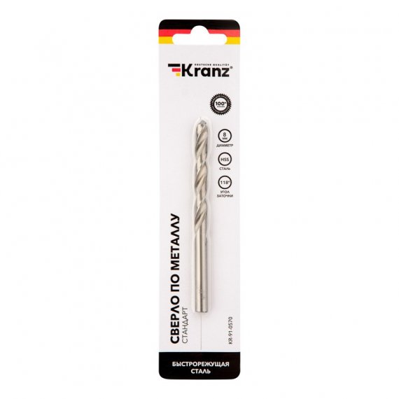 Сверло по металлу 8,0х117х75 мм HSS (1 шт. в упаковке) DIN 338 Kranz