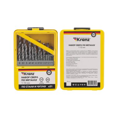 Набор сверл по металлу, 1-10мм (через 0,5мм, 3,2мм, 4,8мм), HSS, цилиндрический хвостовик, металлический кейс, 21 шт. KRANZ Набор из износостойких сверл по металлу (21 шт.) KRANZ с углом заточки 118 градусов предназначен для сверления мягких и средних по твердости изделий из металла, стали, пластика, дерева и т.д. Сверла совместимы со всеми типами дрелей и сверлильных станков. Оснащены цилиндрическими хвостовиками. Изделия выполнены из высококачественной быстрорежущей стали. Материал и технология производства гарантируют высокую производительность, долговечность и износостойкость сверл. Набор упакован в надежный металлический кейс, что делает процесс хранения и использования удобным и практичным. Комплект содержит сверла часто используемых диаметров: 1-1,5-2-2,5-3-3,2-3,5-4-4,5-4,8-5-5,5-6-6,5-7-7,5-8-8,5-9-9,5-10 мм.