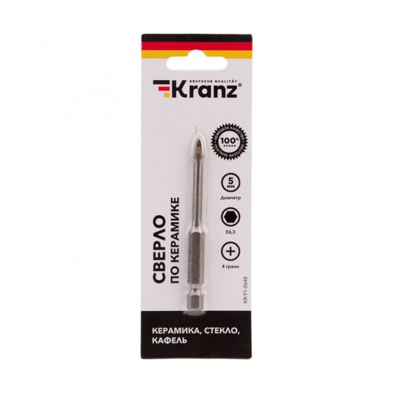 Сверло по стеклу и керамике 5 мм 4 грани шестигранный хвостовик Kranz