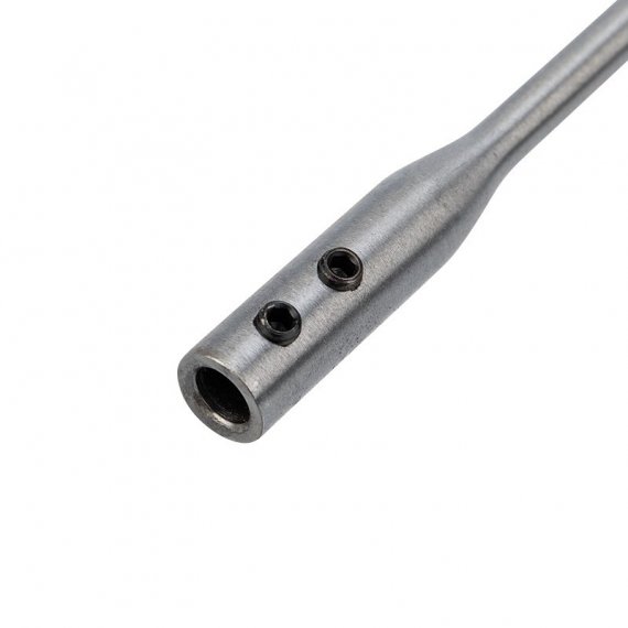 Изготовлен из высококачественной углеродистой стали. Имеет шестигранное посадочное отверстие с двумя поперечными крепежными винтами для надежной фиксации хвостовиков перовых сверл. Хвостовик удлинителя также имеет шестигранную форму, что предотвращает поворот сверла в патроне дрели.