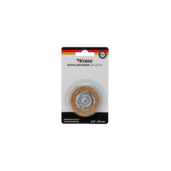 Щетка дисковая для дрели, витая латунированная проволока, 50мм KRANZ Дисковая щетка KRANZ применяется совместно с дрелью для удаления застарелых лакокрасочных покрытий, въевшейся грязи, ржавчины, окалины с поверхностей стальных изделий. Используется для зачистки сварных швов. Витая щетина из латунированной проволоки оптимально подходит для аккуратной обработки и шлифовки, позволяет удалить тонкий слой материала, а также придать поверхности глянцевый блеск. Латунированная проволока имеет высокую устойчивость к коррозии, а при работе возникает меньше искр. Также для дополнительной защиты от коррозии корпус оцинкован, а щетина покрыта маслом. Щетка оснащена цилиндрическим хвостовиком, который позволяет легко устанавливать ее на большинство электрических дрелей. Инструмент соответствует действующим стандартам качества и подходит для использования в условиях интенсивного и сложного труда.