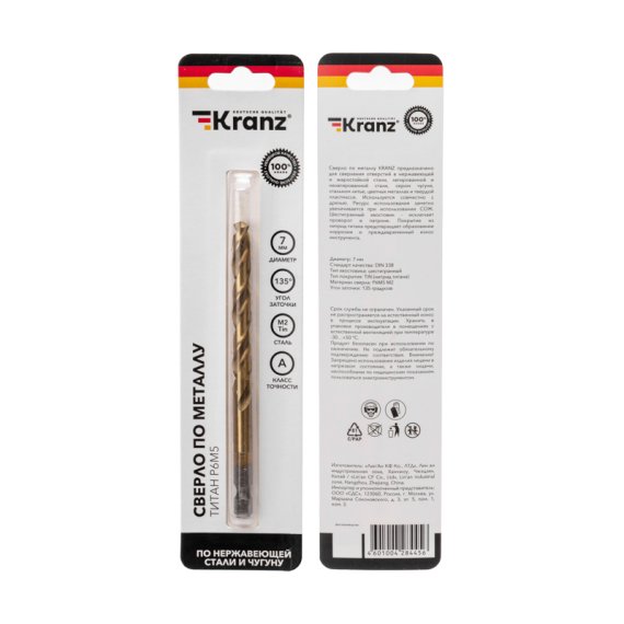 Сверло по металлу, 7мм, Р6М5, ТИТАН, шестигранный хвостовик (1 шт. в упаковке) DIN 338 KRANZ Сверло по металлу KRANZ предназначено для сверления отверстий в нержавеющей и жаростойкой стали, легированной и нелегированной стали, сером чугуне, стальном литье, цветных металлах и твердой пластмассе. Используется совместно с дрелью. Изделие выполнено из качественной быстрорежущей стали Р6М5, что обеспечивает долгий ресурс работы, высокую производительность, устойчивость к перегреву и высоким нагрузкам. Сверло обладает пониженным коэффициентом трения и обеспечивает эффективный отвод стружки. Рабочая часть инструмента позволяет быстро и надежно сверлить металл, гарантирует ровные и аккуратные отверстия. Заточка режущей части под углом 135 градусов способствует эффективному входу в материал. Покрытие из нитрид-титана предотвращает образование коррозии и преждевременный износ инструмента. Шестигранный хвостовик исключает проворачивание в зажимных патронах. Ресурс использования заметно увеличивается при использовании СОЖ.