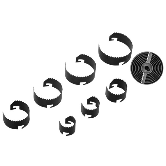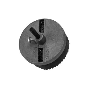 Кольцевая пила состоит из держателя и коронок диаметром 26, 32, 38, 45, 50, 56, 63 мм, позволяющих вырезать круглые отверстия глубиной до 1 дюйма в дереве, ДВП и ДСП.