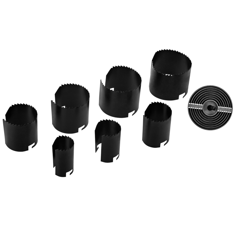 Кольцевая пила состоит из держателя и коронок диаметром 26, 32, 38, 45, 50, 56, 63 мм, позволяющих вырезать круглые отверстия глубиной до 2 дюймов в дереве, ДВП и ДСП.