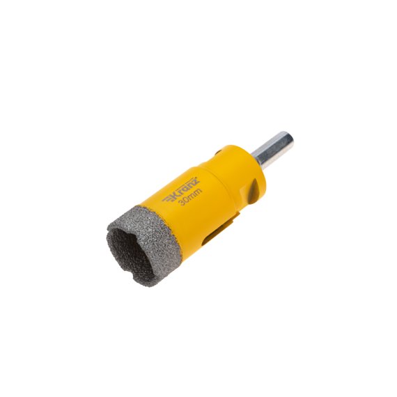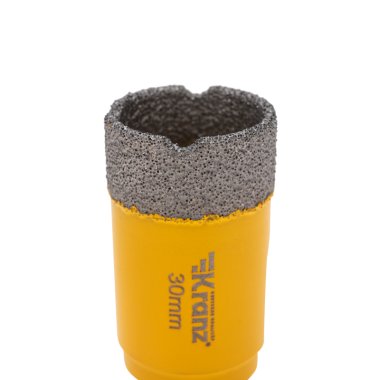 Коронка алмазная профессиональная по керамограниту и железобетону М14, вакуумное спекание, 30мм, для УШМ KRANZ Высокоскоростная алмазная коронка по керамограниту и железобетону предназначена для сверления отверстий в различных материалах, включая керамогранит, камень, керамику, бетон, кирпич и ограниченно в листовом металле, дереве и их комбинациях. Для использования данной коронки рекомендуется угловая шлифовальная машина (УШМ), к которой она легко крепится при помощи резьбы М14. Изделие предназначено для работы в режиме безударного сверления. Применение технологии высокотемпературного вакуумного спекания алмазов позволяет сверлить самые твердые материалы без применения водяного охлаждения. Высота алмазного слоя составляет 15 мм, а максимальная глубина сверления достигает 45 мм. Особенности данной алмазной коронки включают высокую плотность и равномерное расположение алмазов на рабочей кромке. Это гарантирует эффективную работу при сверлении и обеспечивает продолжительный срок службы инструмента.