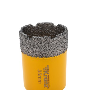 Коронка алмазная профессиональная по керамограниту и железобетону М14, вакуумное спекание, 35мм, для УШМ KRANZ Высокоскоростная алмазная коронка по керамограниту и железобетону предназначена для сверления отверстий в различных материалах, включая керамогранит, камень, керамику, бетон, кирпич и ограниченно в листовом металле, дереве и их комбинациях. Для использования данной коронки рекомендуется угловая шлифовальная машина (УШМ), к которой она легко крепится при помощи резьбы М14. Изделие предназначено для работы в режиме безударного сверления. Применение технологии высокотемпературного вакуумного спекания алмазов позволяет сверлить самые твердые материалы без применения водяного охлаждения. Высота алмазного слоя составляет 15 мм, а максимальная глубина сверления достигает 45 мм. Особенности данной алмазной коронки включают высокую плотность и равномерное расположение алмазов на рабочей кромке. Это гарантирует эффективную работу при сверлении и обеспечивает продолжительный срок службы инструмента.